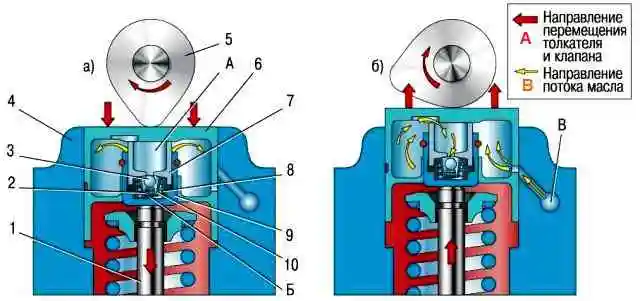 Таким образом, обеспечивается постоянный контакт толкателя с кулачком распределительного вала без зазора.