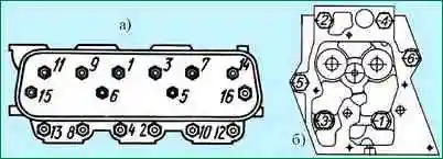 Гайки крепления головок цилиндров затягивать на холодном двигателе в порядке возрастания номеров, как показано на рис. 4 не менее чем за три приема: