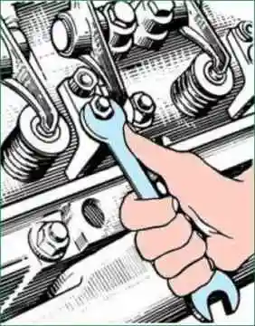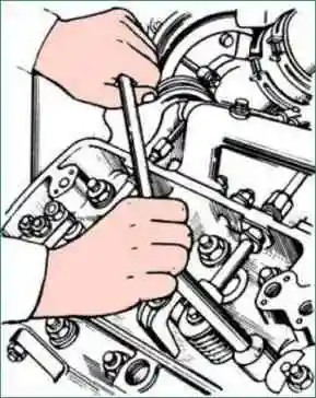 Отвернуть гайки крепления осей коромысел, снять оси коромысел в сборе с коромыслами и извлечь штанги.