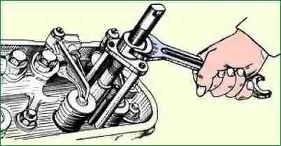 Клапаны, пружины и детали их крепления установить на головку цилиндров и засухарить клапаны, используя приспособление (см. рис. 5).