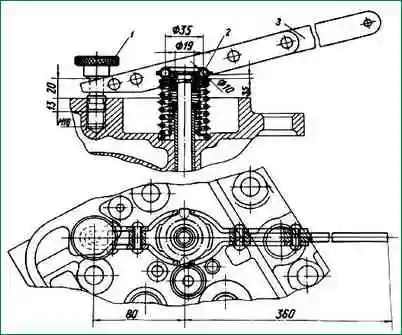 Для этой цели ввернуть упорный болт 1 приспособления в отверстие под шпильку крепления оси коромысла, нажимную тарелку 2 приспособления установить на тарелку пружин соответствующего клапана и, нажимая на рукоятку 3 рычага приспособления, отжать пружины клапана, вынуть сухари и снять все детали клапанного узла.