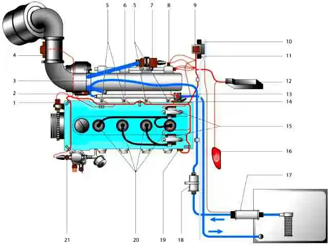 Схема комплексной системы управления работой двигателя ЗМЗ-406: 1 – датчик углового положения коленчатого вала (датчик синхронизации); 2 – датчик положения дроссельной заслонки; 3 – дроссельная заслонка; 4 – датчик массового расхода воздуха; 5 – электромагнитные форсунки; 6 – топливная рампа; 7 – регулятор дополнительного воздуха; 8 – датчик температуры воздуха во впускном трубопроводе; 9 – диагностический разъем; 10 – реле системы управления двигателем; 11 – реле топливного насоса; 12 – электронный блок управления двигателем; 13 – регулятор давления топлива; 14 – датчик детонации; 15 – катушки зажигания; 16 – лампа сигнализатора; 17 – топливный насос; 18 – топливный фильтр; 19 – датчик положения распределительного вала (фазы); 20 – свечи зажигания; 21 – датчик температуры охлаждающей жидкости