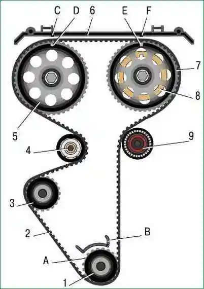 Схема привода газораспределительного механизма: 1 - зубчатый шкив коленчатого вала; 2 - зубчатый ремень; 3 - шкив водяного насоса; 4 - натяжной ролик; 5 - шкив распределительного вала выпускных клапанов; 6 - задняя защитная крышка зубчатого ремня; 7 - шкив распределительного вала впускных клапанов; 8 - кольцо (диск синхронизации) для датчика фаз; 9 - опорный ролик; А - установочная метка ВМТ на зубчатом шкиве коленчатого вала; В - установочные метка на крышке масляного насоса; C, F - установочные метки на задней защитной крышке зубчатого ремня; D - установочная метка распределительного вала выпускных клапанов; E - установочная метка распределительного вала впускных клапанов