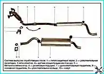 Система выпуска состоит из выпускного коллектора, выполненного заодно с катколлектором, дополнительного и основного глушителей и соединяющих их труб