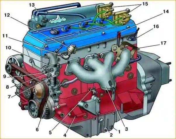 View of the ZMZ-4062 engine from the left side: 1 - drain plug; 2 - oil sump; 3 - exhaust manifold; 4 - engine support bracket; 5 - coolant drain valve; 6 - water pump; 7 - coolant overheat lamp sensor; 8 - coolant temperature indicator sensor; 9 - temperature sensor; 10 - thermostat; 11 - emergency oil pressure lamp sensor; 12 - oil pressure indicator sensor; 13 - crankcase ventilation hose; 14 - oil level indicator (dipstick); 15 - ignition coil; 16 - phase sensor; 17 - heat shield