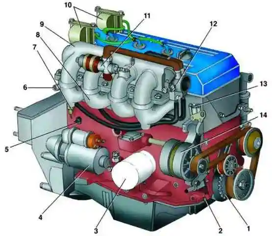 View of the ZMZ-4062 engine on the right side: 1 - synchronization disk; 2 - speed and synchronization sensor; 3 - oil filter; 4 - starter; 5 - knock sensor; 6 - coolant drain pipe; 7 - air temperature sensor; 8 - inlet pipe; 9 - receiver; 10 - ignition coil; 11 - idle speed regulator; 12 - throttle; 13 - hydraulic chain tensioner; 14 - generator