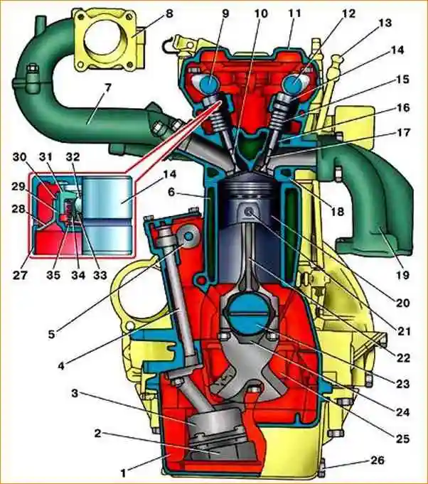 Cross section of the ZMZ-4062 engine: 1 - oil sump; 2 - oil pump receiver; 3 - oil pump; 4 - oil pump drive; 5 - intermediate shaft gear; 6 - cylinder block; 7 - inlet pipe; 8 - receiver; 9 - intake camshaft; 10 - inlet valve; 11 - valve cover; 12-camshaft exhaust valves; 13 - oil level indicator; 14 - hydraulic valve tappet; 15 - outer spring of the valve; 16 - valve guide 17 - exhaust valve; 18 - cylinder head; 19 - exhaust manifold; 20 - piston; 21 - piston pin; 22 - connecting rod; 23 - crankshaft; 24 - connecting rod cover; 25 - main bearing cap; 26 - drain plug; 27 - pusher body; 28 - guide sleeve; 29 - compensator body; 30 - retaining ring; 31 - compensator piston; 32 - ball valve; 33 - ball valve spring; 34 - body of the ball valve; 35 - expanding spring