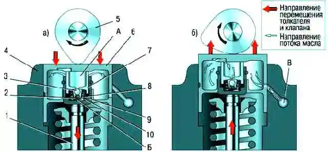 The operation of the hydraulic pusher is based on the principle of incompressibility of engine oil, which constantly fills the internal cavity of the hydraulic pusher during engine operation and moves its plunger when a gap appears in the valve drive.