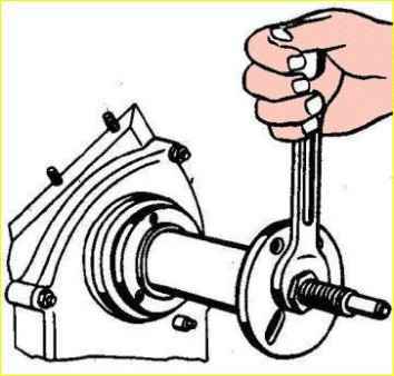 The check is carried out as follows: place a screwdriver (wrench, hammer handle, etc.) between the first crank of the shaft and the front wall of the block and, using it as a lever, press the shaft towards the rear of the engine.