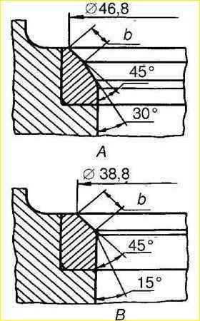 The outer diameter of the chamfer at the seat for the intake valve should be 46.8 mm, and at the exhaust valve - 38.8 mm.