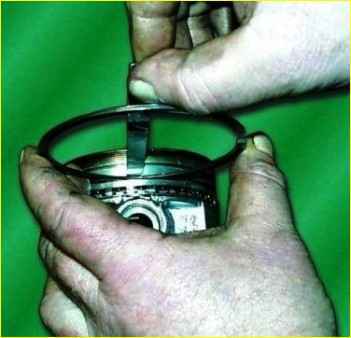 Heat the piston to a temperature of 60-88° C, lightly lubricate the piston pin with engine oil.