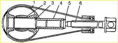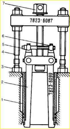 Having inserted the puller legs into the engine cylinder, you should rest the pins 4 against the block and move the legs apart with an expansion bolt 5. Then, by rotating the screw 7, press the liner out of the cylinder;