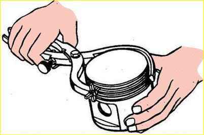 - put safety brass tips on the connecting rod bolts, compress the rings with a crimp or, using a conical ring, insert the piston into the cylinder, as shown in the figure.