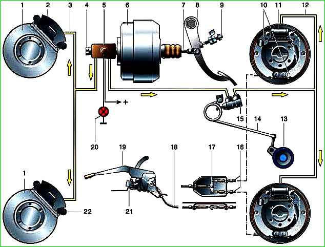 The service brake system is hydraulic, dual-circuit (divided into front and rear circuits), with a vacuum booster, a pressure regulator and a sensor for an emergency drop in the brake fluid level in the reservoir.