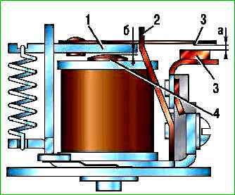 The gap “a” (Fig. 2) between contacts 3 should be 0.8 mm, and the gap “b” between the relay coil core 4 and armature 1 with contacts 3 closed should be at least 0.15 mm.