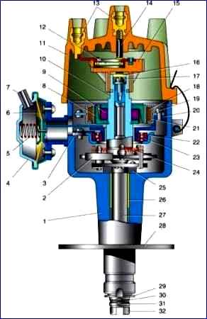 Ignition distributor sensor: 1 - housing; 2 - centrifugal regulator weight; 3 - bearing mounting screw; 4 - vacuum regulator; 5 - vacuum regulator spring; 6 - diaphragm; 7 - fitting; 8 - rotor magnetic circuit; 9 - permanent magnet of the rotor; 10 - rotor; 11 - cover; 12 - noise suppression resistor; 13 - conclusions; 14 - central contact; 15 - slider; 16 - felt; 17 - rotor fastening screw: 18 - stator winding; 19 - stator fastening screw; 20 - stator; 21 - magnetic circuit of the stator winding; 22 - stator support; 23 - bearing; 24 - weight spring; 25 - thrust washers; 26 - bushing; 27 - roller; 28 - octane corrector plate; 29 - washer; 30 - spring ring; 31 - pin; 32 - drive coupling