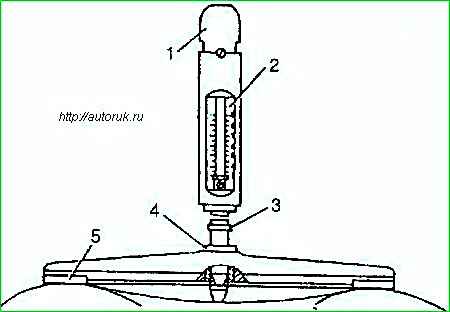 The level is adjusted by bending tongue 4 of the lever of float 1. In this case, the float should be in a horizontal position, and the stroke of valve 3 should be 20-2.3 mm.