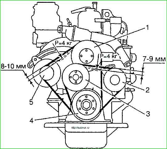 The deflection of the fan drive belt should be within 7-9 mm, the deflection of the coolant pump and generator drive belt should be within 8-10 mm with a load on each of them of 40 N (4 kgf).
