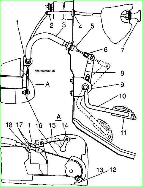 - - place the end of the cable with the tip into the socket of the coupling 6 and secure it with a pin with a cotter pin on the pedal lever with the slot up;