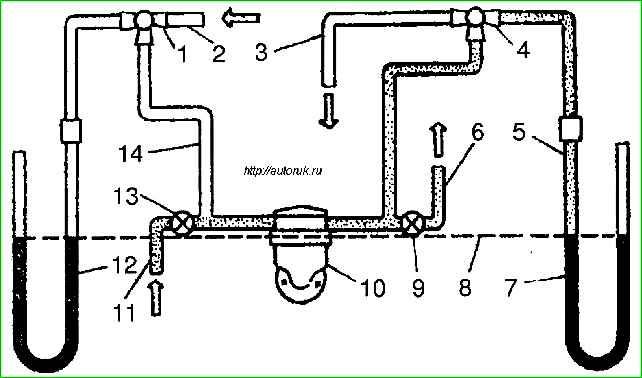The fuel pump is disconnected from the carburetor (the engine is powered by gravity) and connected to a pressure gauge with a scale of up to 100 kPa (1 kgf/cm 2).