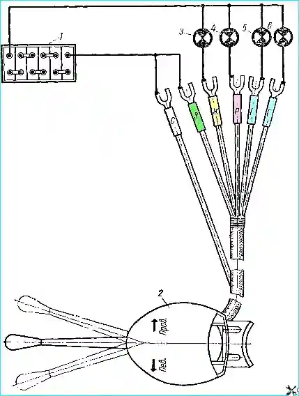 In the neutral position of the switch handle, the right contact plate of the rotor closes terminals 5 and 4, which allows the brake light lamps to be turned on when the brake light switch 14 is turned on.
