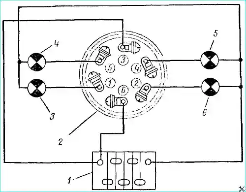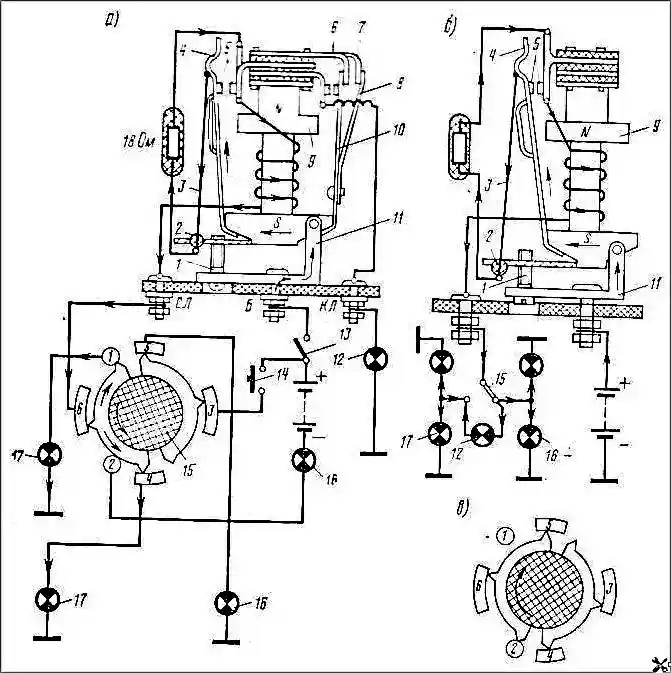 The breaker winding is connected in series with signal lamps 16 or 17, located in the rear light and sidelight, and when using the RS57V, also with control lamp 12, located on the instrument panel in the driver's cabin.