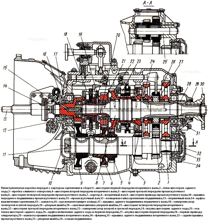 On the neck of a larger diameter there are slots for installing and moving the clutch 26 for reverse gear and first gear.