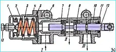 When the valve lever is moved to the right position, the spool moves away from the limiting valve, the groove on the spool is installed against the other oil seal and the air from the tires escapes into the atmosphere.