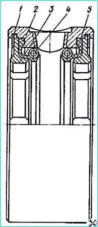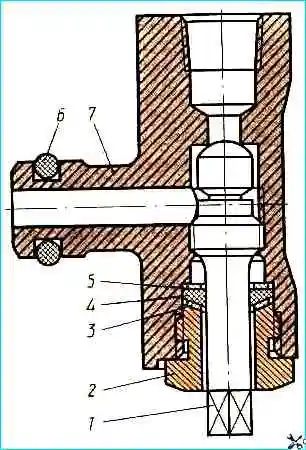 The plug is sealed with a rubber ring 4 with washers 3 and 5 and tightened with a nut 2. The seal of the valve body in the axle shaft seat is ensured by a rubber ring 6.