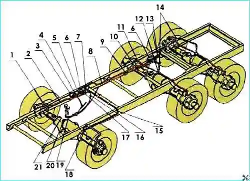The tire pressure regulation system is used on KamAZ-4310 vehicles and is designed to increase the vehicle's cross-country ability on difficult sections of the road by changing the air pressure in the tires