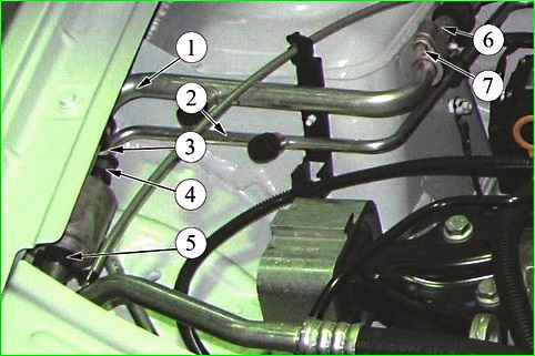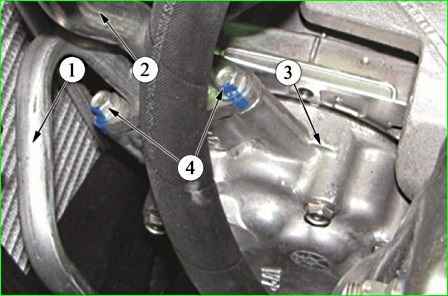 Using a 13 mm wrench, unscrew bolt 3, Figure 2, fastenings and disconnect tube 1 connecting the compressor to the evaporator (short part)