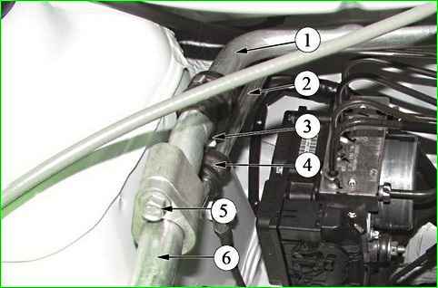 Using a 10 mm head with an extension, unscrew nut 3, pipeline holder 4