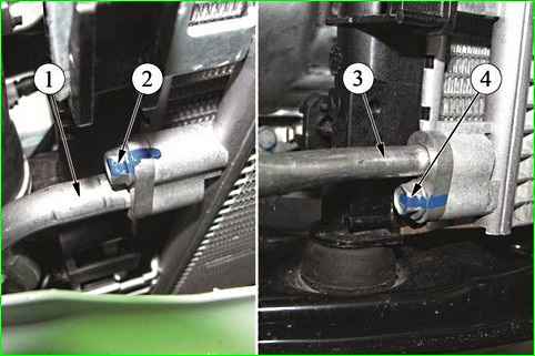 Using a 13 mm head, unscrew bolt 4, fastening the tube connecting the compressor to the condenser