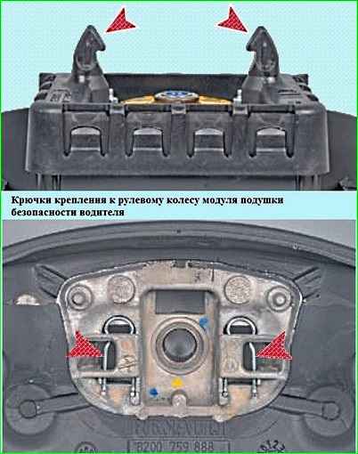 Install the driver's airbag on the steering wheel so that the airbag hooks enter the corresponding holes in the steering wheel and press on the airbag until the airbag hooks snap into place with the steering wheel clamps.