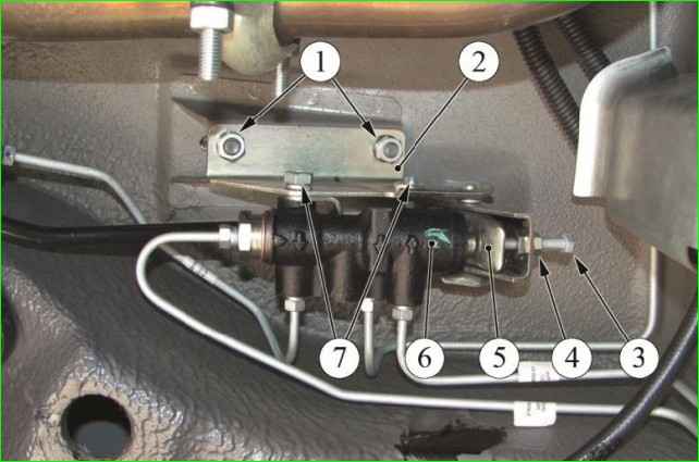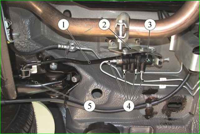 Place a container under the junction of the tubes with the regulator, as fluid will flow out from there, and use a special "10" wrench to unscrew the four nuts securing the brake tubes.