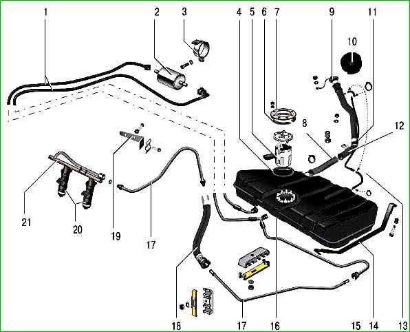 Fuel supply system: 1 - pipes fuel (plastic); 2 - fuel filter; 3 - fuel filter mounting bracket; 4 - fuel pump sealing ring; 5 - fuel pump; 6 - spacer ring; 7 - fuel pump mounting pressure ring; 8 - filler pipe hose; 9 - fuel tank filler pipe plug; 10 - filler pipe neck lining; 11 - clamp; 12 - fuel tank filler pipe; 13 - air bleed hose; 14 - fuel tank mounting clamp; 15 - connector (quick-release connector); 16 - fuel tank; 17 - fuel tubes (metal); 18 - fuel supply hose; 19 - bracket; 20 - injectors; 21 - fuel rail