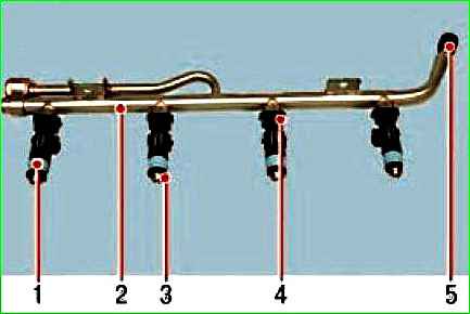 Fuel rail and injectors: 1 - injector; 2 - fuel rail; 3 - sealing ring; 4 - injector retainer; 5 - fuel pressure control nipple cap