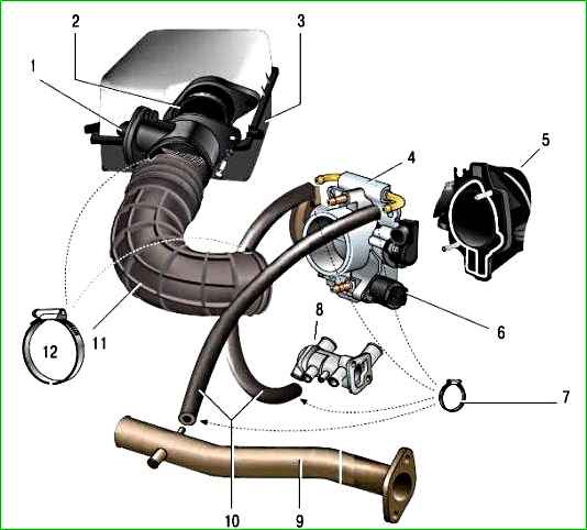 Air supply system: 1 - mass air flow sensor: 2 - sealing sleeve: 3 - air filter: 4 - throttle assembly; 5 - intake manifold: 6 - idle speed control valve or additional air regulator; 7 - hose clamps; 8 - thermostat; 9 - coolant pump inlet pipe; 10 - throttle assembly heating hoses; 11 - air supply sleeve; 12 - air supply hose mounting clamps