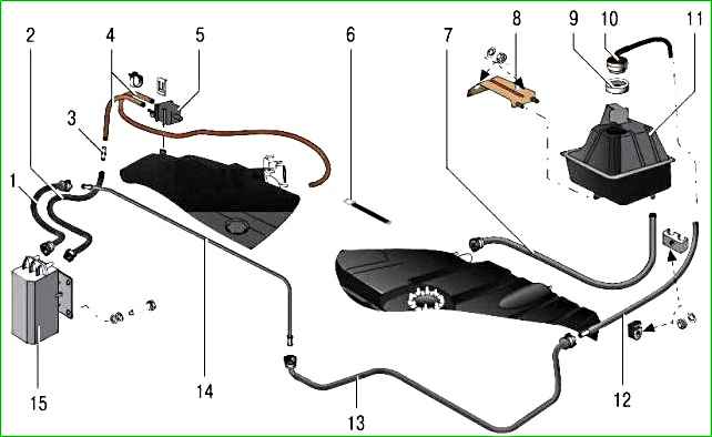Fuel vapor recovery system: 1 - front vapor line tube; 2 - adsorber and purge valve tube; 3 - adapter; 4 - hoses; 5 - adsorber purge valve; 6 - clamp; 7 - fuel drain tube; 8 - separator bracket; 9 - valve gasket; 10 - gravity valve; 11 - fuel vapor separator; 12 - rear vapor line tube; 13 - middle steam pipe; 14 - steam pipe; 15 - adsorber