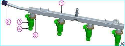 The injector rail is a hollow tube with injectors installed on it. The injector rail is secured to the engine with two bolts.