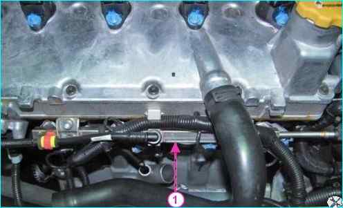 On the injector rail there is a nipple 2 for monitoring the fuel pressure, closed with a threaded plug.
