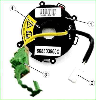 The connector with a rotating device (Fig. 3) in the SNPB part is designed for electrically connecting the driver's airbag module, located on the steering wheel, to the vehicle's electrical wiring.