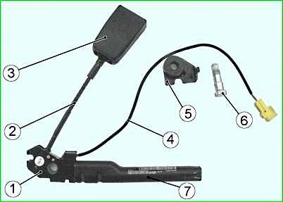 When the pre-tensioning device is triggered, the belt buckle 3 is pulled into the body of the pyrotechnic tube 7 by means of the steel cable 2 and is pulled back, tensioning the belt tape (not allowing the belt tension to weaken), and thus the belt fits tightly around the passenger's body.