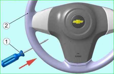 Standing outside the car, to the side of the steering wheel, insert a flat-blade screwdriver 1 (Fig. 1) into the left hole on the steering wheel, press on the screwdriver, and release the module from the steering wheel retainer.