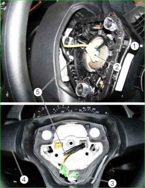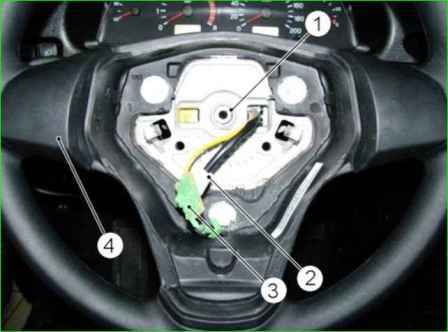 Unscrew nut 1 (Fig. 6) of the steering wheel fastening and remove the steering wheel 4 from the steering shaft, passing connectors 2 and 3 of the wire harness through the hole in the steering wheel hub.