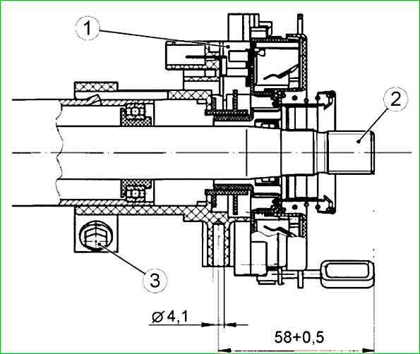 Move connector 1 (Fig. 10) with the rotating device assembly along the shaft axis so that the control dimension from the end of shaft 2 to the axis of the screw securing the lower trim casing to the connector is 58+0.5 mm. Screw in and tighten bolt 3.