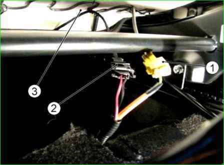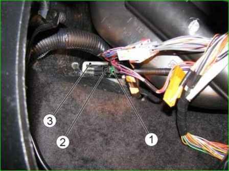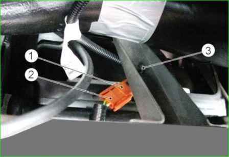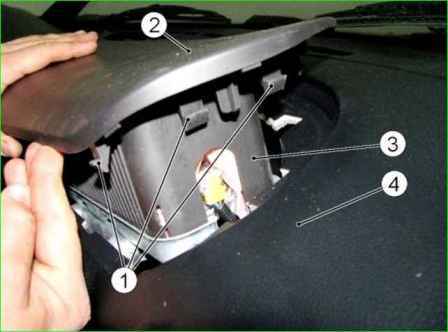Through the opening of the glove compartment, alternately acting on the locks 1 (Fig. 16) of the trim cover 2 of the MNPBP, feeding from below, remove the module 3 of the NPBP from the instrument panel 4.