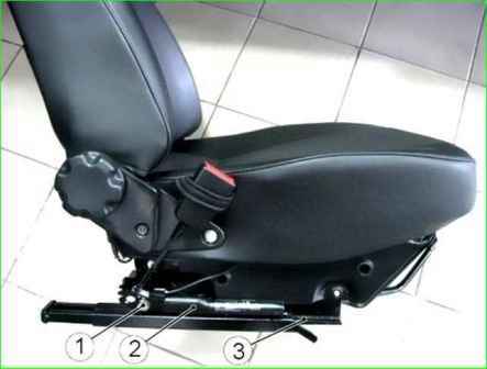 Unscrew bolt 1 (Fig. 19) securing the seat belt pretensioner and, carefully holding the pyrotechnic tube, disconnect the seat belt pretensioner 2 with the spacer from the front seat runners 3.