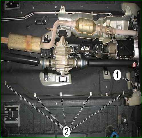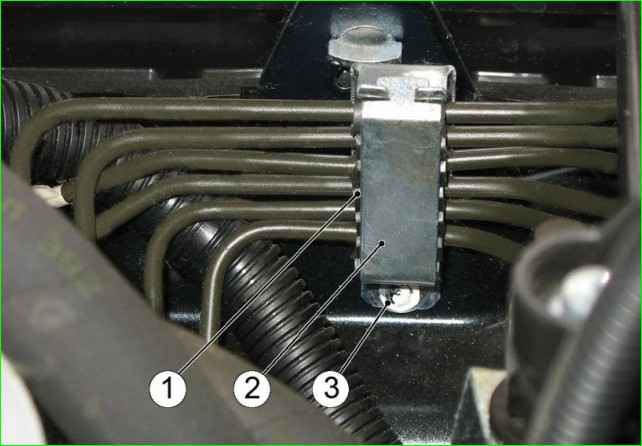 Unscrew the five nuts 2 of the brackets for fastening the tubes to the car body, disconnect the strips from them and remove the brake tube