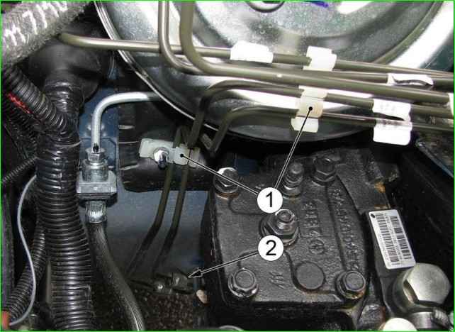 Remove bracket 2 of the hose fastening from the brake pipe fitting